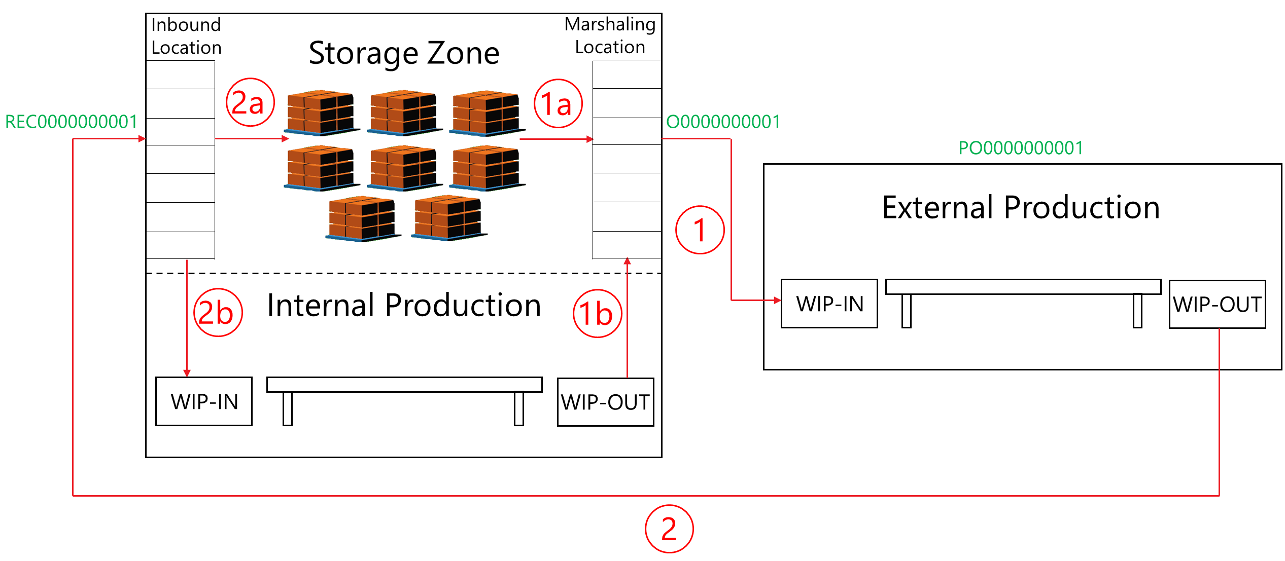 The outputs of an external work center are received on an inbound location (WIP-OUT location of the external work center (2)). These outputs can be put away in a storage zone (2a), or can be used as inputs for a subsequent internal operation (2b). Receipts of an external work center (REC0000000001) are automatically created if the inventory handling and the WIP handling of the outputs is set correctly (Configurator).